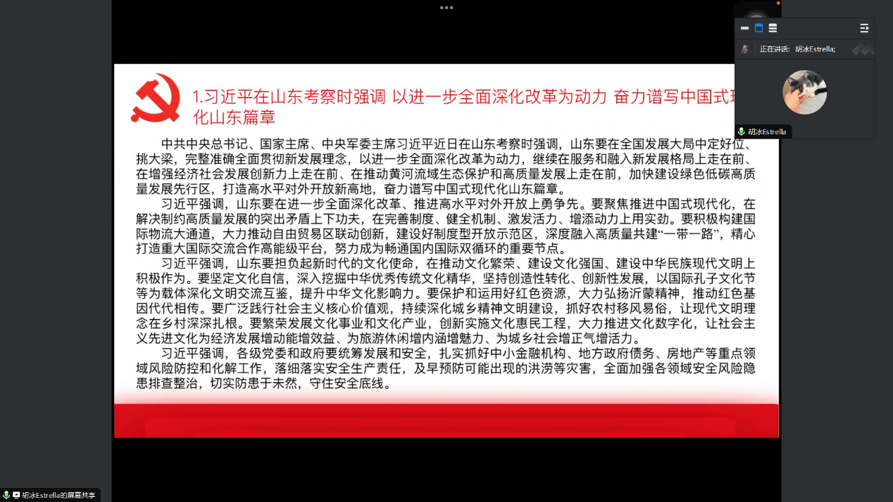 首先,胡冰同志领学了习近平总书记在山东考察时的讲话内容。习近平总书记在山东考察时强调,山东要在全国发展大局中定好位、挑大梁,完整准确全面贯彻新发展理念,以进一步全面深化改革为动力,继续在服务和融入新发展格局上走在前、在增强经济社会发展创新力上走在前、在推动黄河流域生态保护和高质量发展上走在前,加快建设绿色低碳高质量发展先行区,打造高水平对外开放新高地,奋力谱写中国式现代化山东篇章。