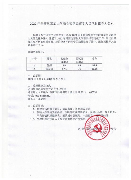 西方语言文化学院2022年哥斯达黎加大学联合奖学金留学人员项目推荐名单公示