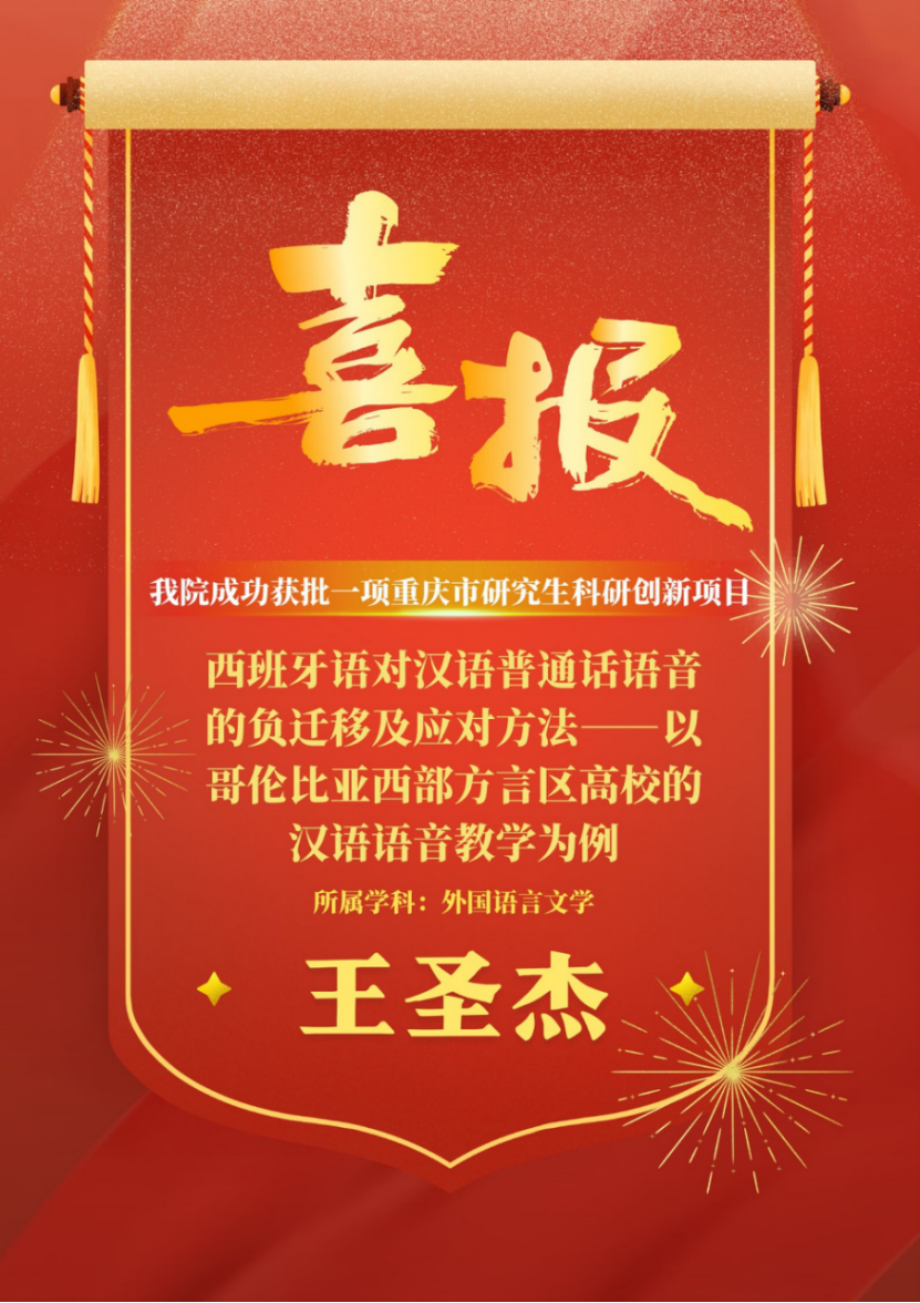 喜报 ! 我院西班牙语语言文学专业硕士研究生王圣杰获批重庆市研究生科研创新项目