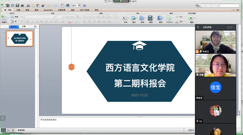 2022年12月22日19:30,西方语言文化学院以线上形式开展了本学期第二次科学论文报告会。活动由朱金玉老师主持,朱金玉和文慧两位老师分享了自己的经验与心得,西方语言文化学院全体教职工参与了本次活动。