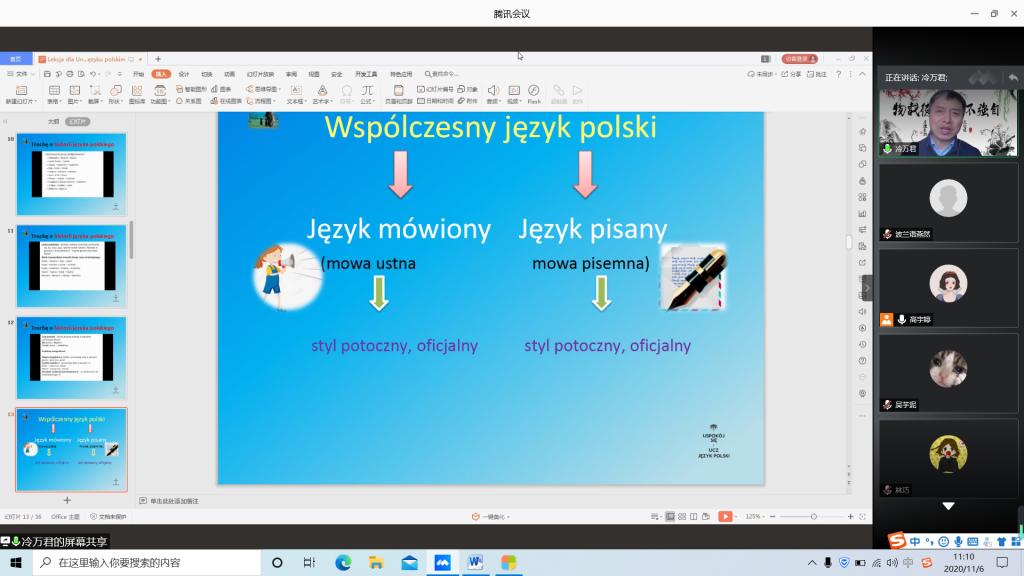2020年11月6日上午,我院波兰语专业在线上开展了现代波兰语学习专题讲座。本场讲座邀请了哈尔滨师范大学波兰语专业冷万君老师为同学们在线讲解波兰语的演变历史和现代波兰语的语体使用情况。波兰语全体师生共同参与了本次专题讲座。