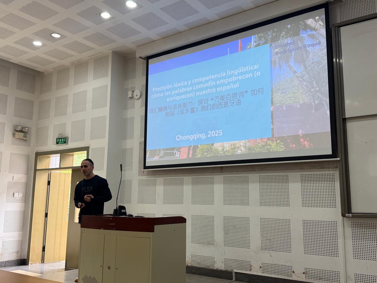 2025年11月3日上午,我院西班牙语系特邀外教Diusbel,在歌乐楼阶梯教室B2-2主讲了以西班牙语“万能搭配词”(palabras comodín)为主题的专题讲座。