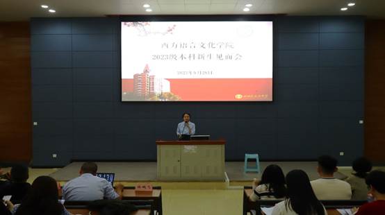2023年9月28日下午,西方语言文化学院2023级本科新生见面会在西区学术报告厅-B举行。学院党总支书记苏雪、副院长(主持工作)谌华侨、党总支副书记许令仪、办公室负责人徐鹏飞、团总支书记李刚、相关专业系主任及老师、2023级全体本科新生参加了会议。2023级本科新生辅导员段文佳主持会议。