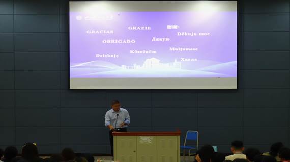 最后,副院长谌华侨做了主题为“院长讲学院”的讲座。他以当代中国外部环境现状为切入点,从办学历史、师资团队、人才培养、科学研究、社会服务、国际合作六个方面向全体新生同学详细介绍了学院情况、教学资源以及培养目标,强调了外语人的历史责任与使命担当,希望同学们努力学习,勇敢追寻自己的理想。