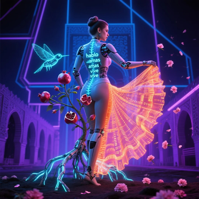 活动要求参赛者以西班牙语学习体验为灵感,通过与AI绘图的互动,创作与西语文化相关的图片作品。其中张祐瑞同学的作品《燃烧的翅膀:灵魂出走》(Alas en llamas: Alma en fuga)获得了一等奖及最佳创意(技术)奖。这幅视觉作品着眼于拉美文化历史中的女性主义。背景熊熊燃烧的火焰象征这片土地的激情、变革及其毁灭与重生的力量。女性决绝前行的姿态,正是娜拉“出走”精神的宣言,宣告逃离禁锢、追寻真我。整幅画面糅合了拉美语境下女性所承载的痛苦、魔力、反叛与对自由的不懈追寻。