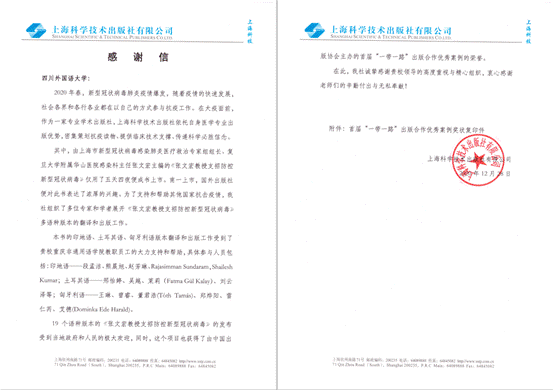 上海科学技术出版社有限公司给川外的感谢信