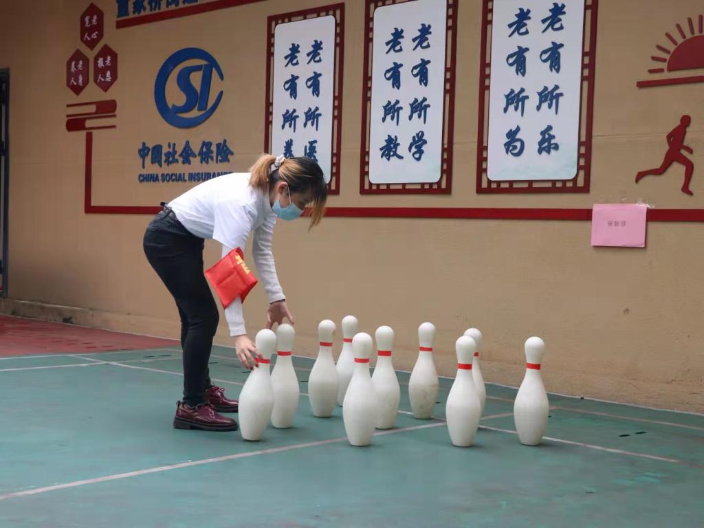 在活动现场,同学们不但配合社区工作人员布置现场,而且还分别接受了各自的任务:项馨同学负责签到工作,丁雨馨和于冰倩同学负责猜谜语活动,王小雨同学负责吹乒乓活动,陈洁同学负责保龄球活动并协调各位同学的工作,郑瑜同学配合其他同学的工作。活动中,同学们疏导老人们到人少的区域活动,引导和帮助老人们去不同区域参与项目打卡,并提醒老人们注意地面湿滑。同学们耐心细致热情的服务得到了社区工作人员和老人们的交口称赞。