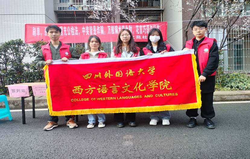 202333午,西方语言文化学院党总支书记苏雪、党总支副书记许令仪团总支书记李刚、团总支副书记刘青清刘洁、刘文洁、王心悦、程天囿、谢超凡五位同学来到学校文苑社区协助社区工作人员为“弘扬雷锋精神,服务社区居民”主题便民服务活动进行志愿服务