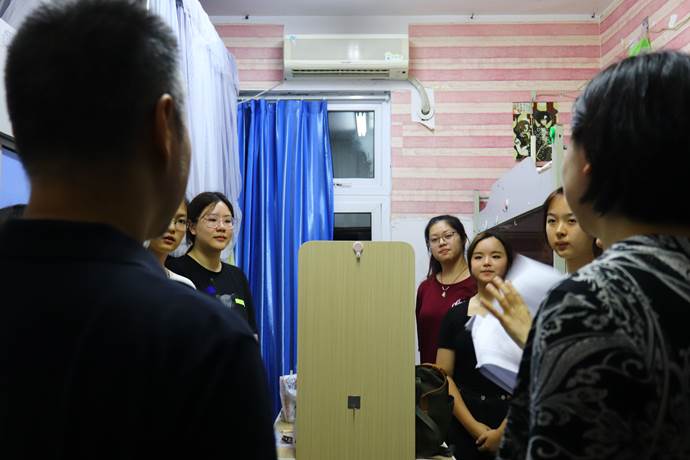 9月13日傍晚7时,西方语言文化学院党总支书记苏雪、党总支副书记许令仪和新生辅导员段文佳一起走访新生寝室,了解宿舍入住情况,关心并跟进解决同学们在生活和住宿方面的问题。