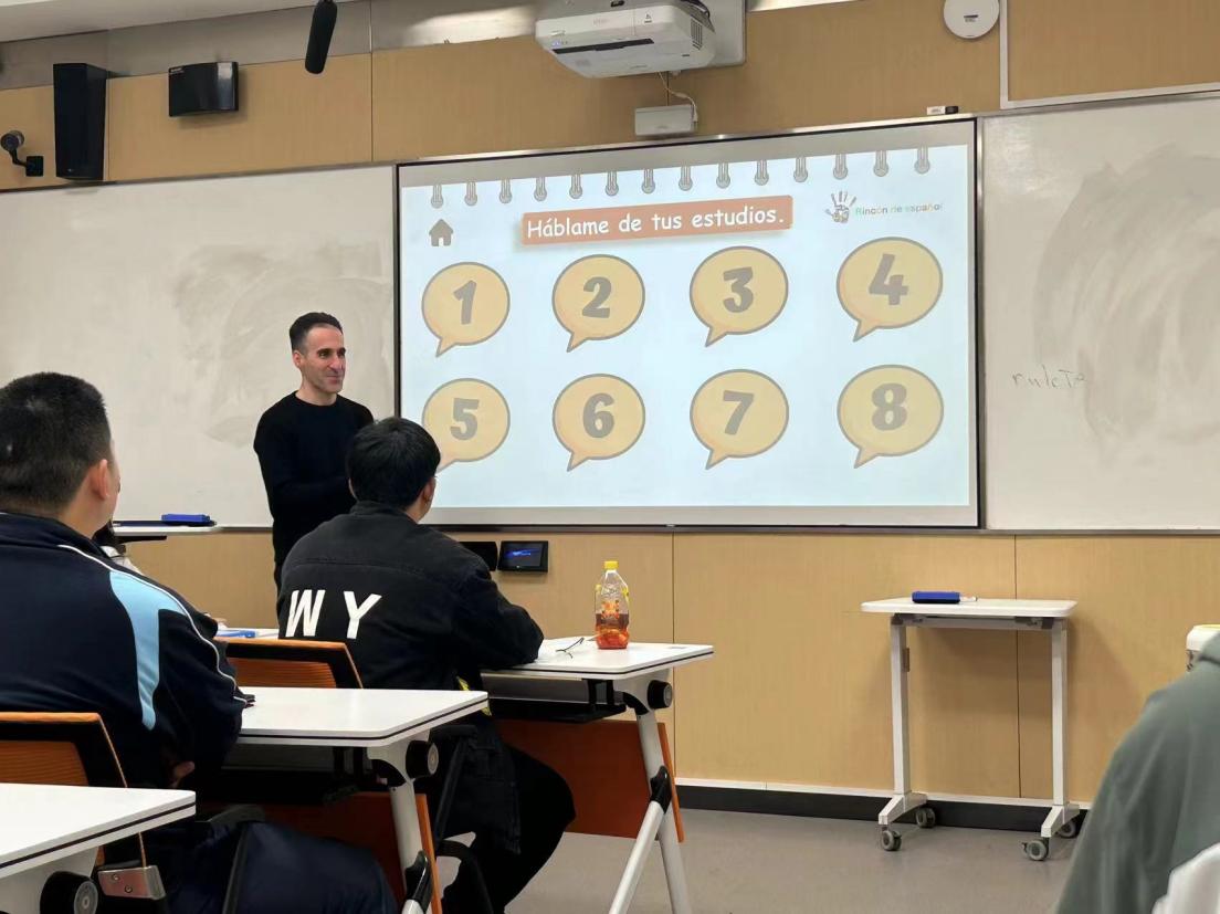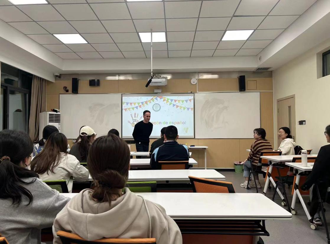 2023年11月28日晚上7点,西方语言文化学院本学期第三期西班牙语角在歌乐楼B602顺利开展。在活动开始前,同学们就迫不及待地想跟外教见面了。他们热烈地讨论着——“你见过这个外教吗?”“没有,但是在课堂上听老师说过他的课很有趣。”在月亮羞涩地露出半张脸时,同学们已在教室静待已久。