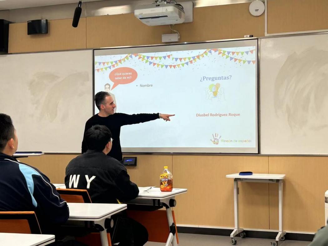 “¡Hola!”一声亲切的问候成功将同学们带入到Diusbel的课堂中。Diusbel先向同学们介绍本次活动的主题:¡Vamos a hablar!——“破冰行动”。紧接着Diusbel让同学们猜他的名字。有一位同学十分机智,知道猜不出来,便立即用西班牙语问到:“您叫什么名字?”;Diusbel哈哈大笑,竖起大拇指为他的机智点赞,并回答了自己的名字。“破冰行动”就此拉开序幕。