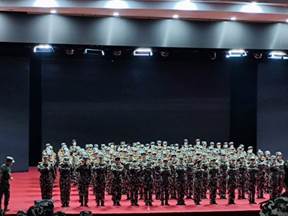 在军训汇报演出中,半月军训的汗水在这一刻凝结成胜利的花朵。今天,他们是自己的主角,今天,他们享受着自己胜利的荣光西语学院的学子所在的连队以良好的精神风貌和优异的训练成果获得了好评,最终被授予“优秀连队”光荣称号。