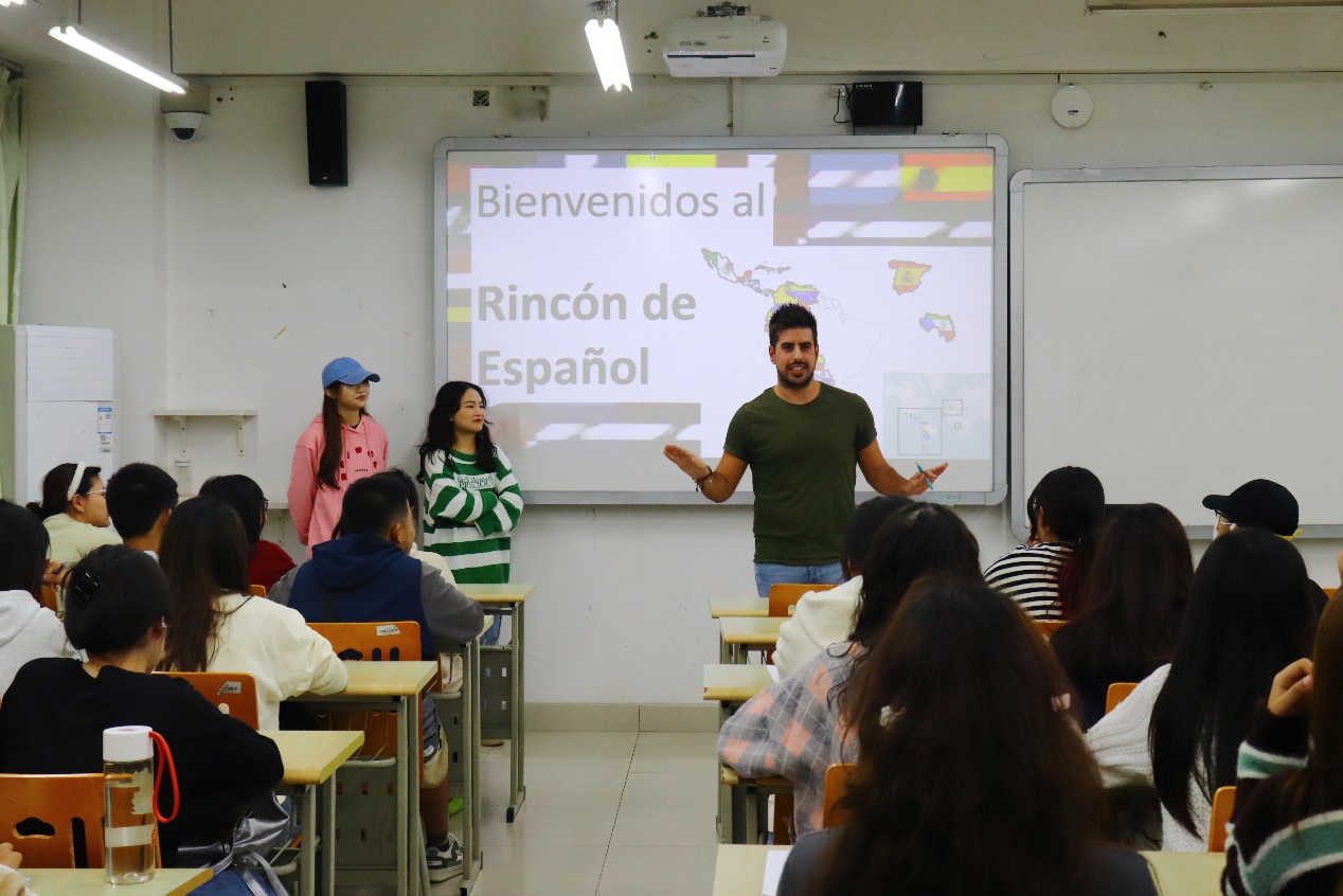 2023年10月31日晚上7点,西方语言文化学院2023-2024学年首次西语角在歌乐楼B304举行。本次西语角由外教Alberto组织,西班牙语专业2023级全体同学参加。一年级的新同学们对与外教的初次会面翘首以盼,对此次活动充满了期待。