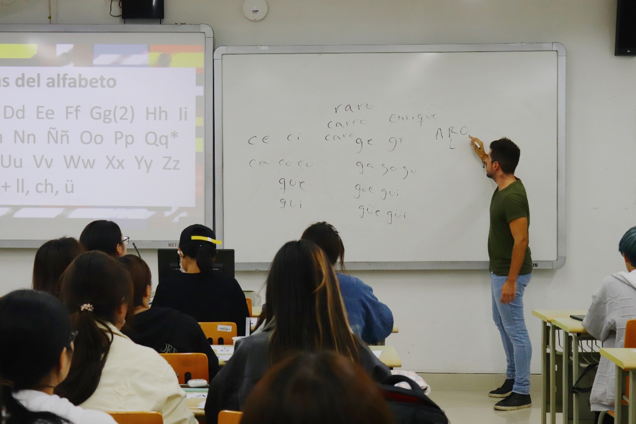 在活动正式开始之前,Alberto老师向同学们介绍了本次西语角的主要内容,包括自我介绍、字母拼读、绕口令和猜词游戏等。首先,Alberto通过一问一答的方式让同学们进行了自我介绍。接着,同学们分组跟读字母表,并进行了字母拼读练习。
