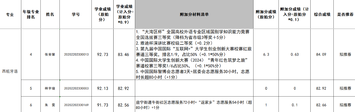 学校分配给学院推荐名额10人(西班牙语专业3人、意大利语专业2人、葡萄牙语专业1人、匈牙利语专业2人、捷克语专业2人)。学院在学校分配名额基础上按照1:1.5的比例,并结合各专业学生人数比例,进行差额推荐,差额推荐名额为15人(西班牙语专业4人、意大利语专业3人、葡萄牙语专业2人、匈牙利语专业3人、捷克语专业3人)。