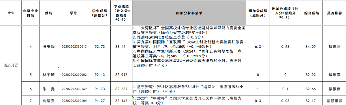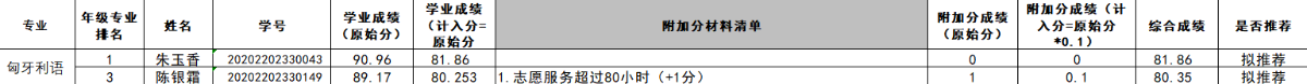 学校目前分配给学院推荐名额9人(西班牙语专业3人、意大利语专业1人、葡萄牙语专业1人、匈牙利语专业2人、捷克语专业2人)。学院在学校分配名额基础上按照1:1.5的比例,并结合各专业学生人数比例,进行差额推荐,差额推荐名额为14人(西班牙语专业4人、意大利语专业2人、葡萄牙语专业2人、匈牙利语专业3人、捷克语专业3人)。