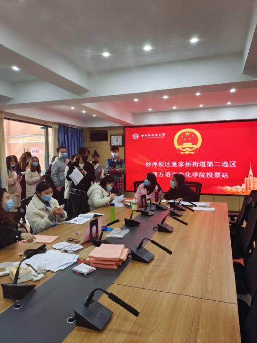 人大代表换届选举是人民政治生活中的一件大事。西方语言文化学院党政领导高度重视此次选举工作,成立了选举工作领导小组,严格依照《选举法》和沙坪坝区换届选举相关要求组织落实选举工作。学院不但在前期进行了广泛宣传,而且在选举当日学院投票站工作人员严格遵守选举流程,做好选票的发放、回收、计票和封存,同时按照防疫要求做好防控措施,圆满完成了此次选举工作。