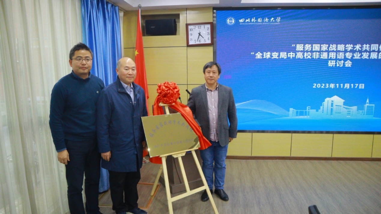 张春林首先介绍了“服务国家战略学术共同体”的研究领域“海外中国叙事与叙事中国研究”及学术主张“真问题、铁事实、精文本”,希望非通用语专业老师能够跳出各自语种、跳出区域国别、跳出外国语言文学来思考问题,融入到广泛的跨学科学术平台。然后,王仁强、张春林、谌华侨共同为“服务国家战略学术共同体(海外中国叙事与叙事中国研究)”揭牌。