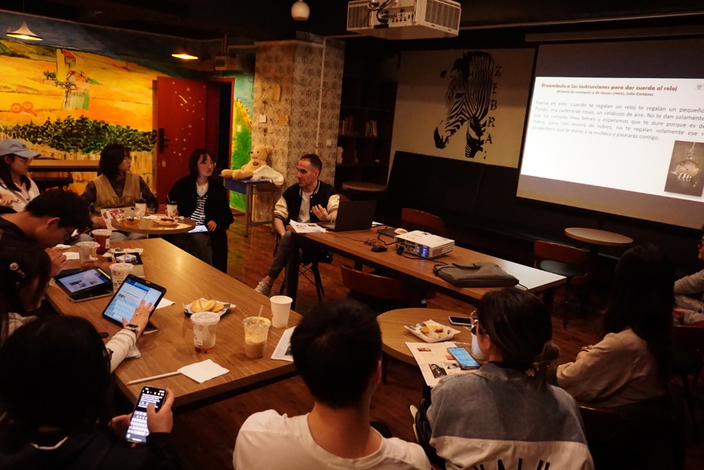 2024年11月6日晚7点,我院西班牙语系三年级学生与外教Diusbel老师在“时光若刻”咖啡馆内进行了2024-2025学年第一学期的首场“西语文学沙龙”。本次活动的主题是师生共同分享对故事《手表上弦指南之前言》的感受。该小说收录在著名阿根廷作家胡里奥·科塔萨尔的最具代表性的作品之一的《克罗诺皮奥与法玛的故事》(1962年)一书中。