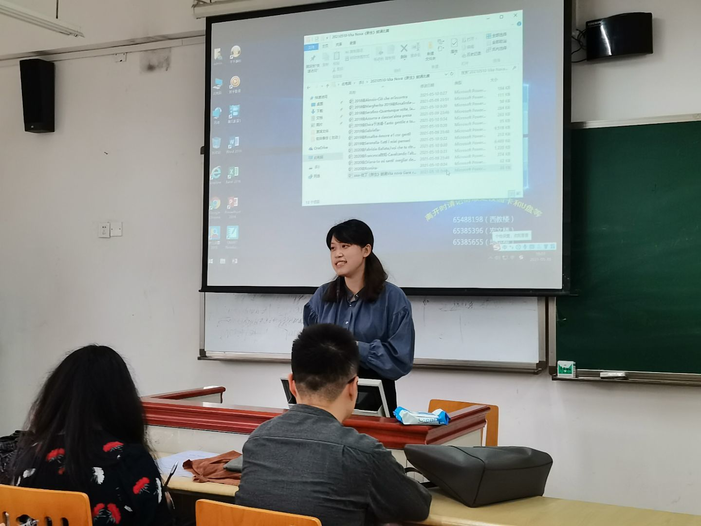 活动伊始,李书竹老师请参赛同学抽签决定上场顺序。抽签完毕后,同学们就自己选取的《新生》诗集片段,依次上台进行朗诵。选手们声情并茂、抑扬顿挫,动情的朗诵搭配上制作精美的PPT以及背景音乐,为在场的所有人带来了一场意大利语诗集的视听盛宴,赢得阵阵热烈掌声。最后,经过评委老师的讨论和打分,尹章全同学荣获本次朗诵比赛一等奖;田文静同学、李东奇同学以及刘芷怡同学获大赛二等奖;崔玮捷同学、丁雨馨同学、黄丹艺同学以及陈洁同学也获得了三等奖。