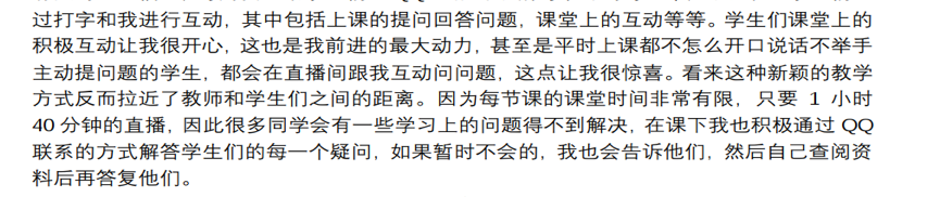 虽然相距遥远,隔着冷冰冰的屏幕,但“见屏如面”,同学们克服各种困难,努力学习。根据老师们每天的教学情况反馈,同学们的出勤、作业完成、课堂参与度均保持在理想状态。从某种程度上说,这种教学方式虽然对同学们的自学、自控能力有较高要求,但也正好激发出大家的自主精神,迫使大家反思、改进自己的学习态度和学习方法。