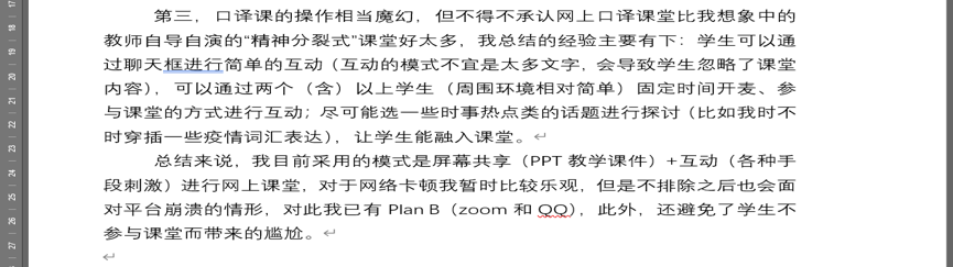 为了实现“方式改变,质量不变”,老师们可谓各显神通,多头并进:除了常规的备课任务外,还需要根据线上教学的特点调整教学方式和课程内容、熟悉各类教学平台,甚至包括添置或更新教学设备。在老师们的精心准备下,2月24日,本学期教学工作如期开展,现在,前两周在线教学辅导工作顺利结束。