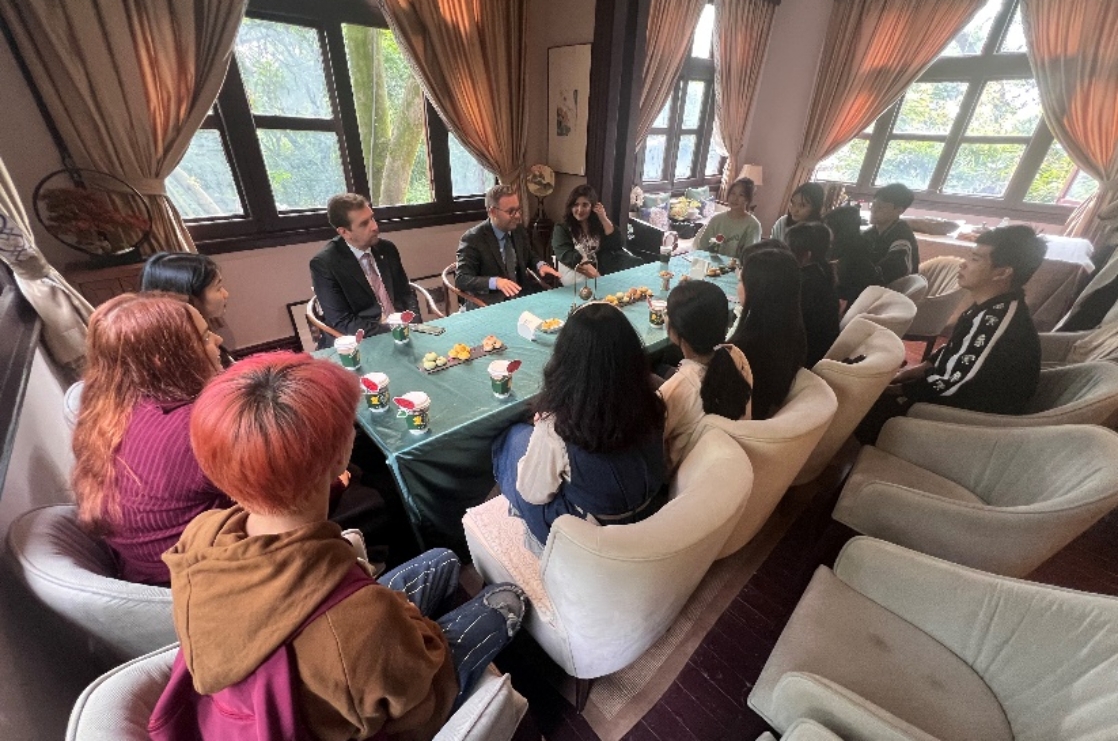 随后,根据领事馆的相关安排,众人一同前往了鹅岭公园内的一家小咖啡厅进行座谈,座谈会中,匈牙利语专业的学生和欧尔班先生等人就匈牙利语学习、匈牙利生活等内容进行了交流。在此期间,匈牙利语专业的学生们还为远道而来的欧尔班先生合唱了一首匈牙利语民歌《Tavasszi szél》(春风)与一首中国民歌《茉莉花》。