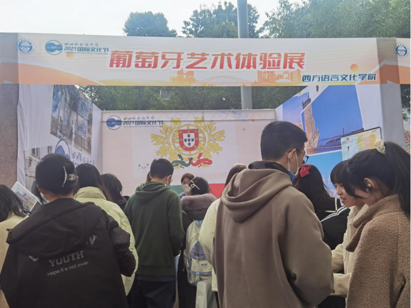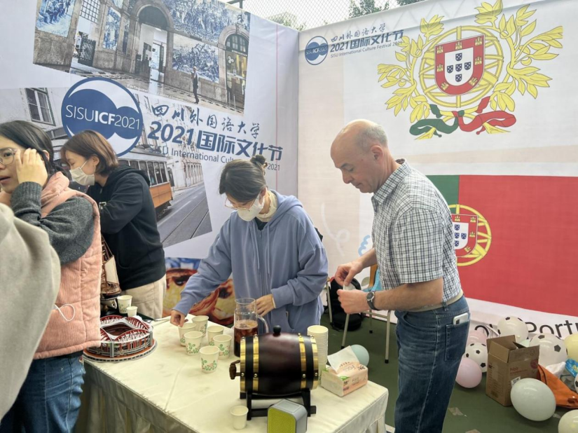 在葡萄牙语展区,葡萄牙国粹法多(Fado)余音绕梁,展台点缀着具有经典葡萄牙特色的展品,如贝伦塔、航海大发现帆船、波尔图红酒桶、本菲卡球场、葡萄牙瓷板画等。除了有踢球和挑战葡语句子的活动外,外教Alberto还给前来的嘉宾和同学们精心制作了葡萄牙特色果酒桑格利亚(Sangria),入口清新醇香,令人回味无穷。