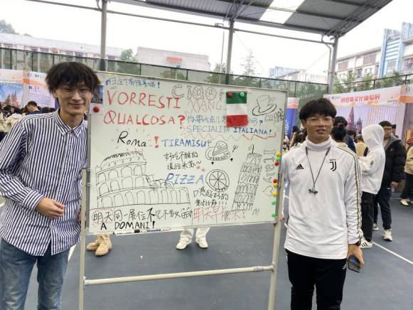 在意大利语展区,人流络绎不绝,丰富的活动吸引了许多老师和同学。参观者可以品尝到香醇浓厚的提拉米苏、果香四溢的黑蔓罗红葡萄酒;在互动游戏中,可以深入了解意大利的美食制作;在展区挑战大舌音,得到精美小礼品等等……此外,同学们还可以通过展区的大屏幕同意大利语专业学生一起感受有趣的意语学习生活。