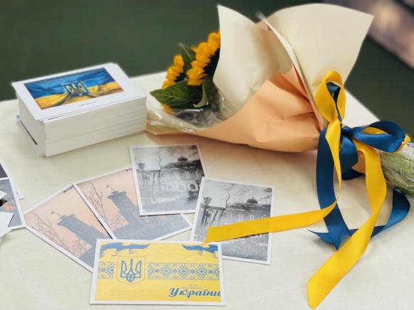 乌克兰语展区以“乌克兰文化”为主题,展示了乌克兰传统服饰及货币中的特殊文化符号。此外,展区还提供手磨咖啡机体验、盲盒交友、玩游戏领取乌克兰本土糖果、学生自制明信片等小活动。展区内不仅有乌克兰特产,还有本专业的师生介绍该国的风土人情与服饰美食。