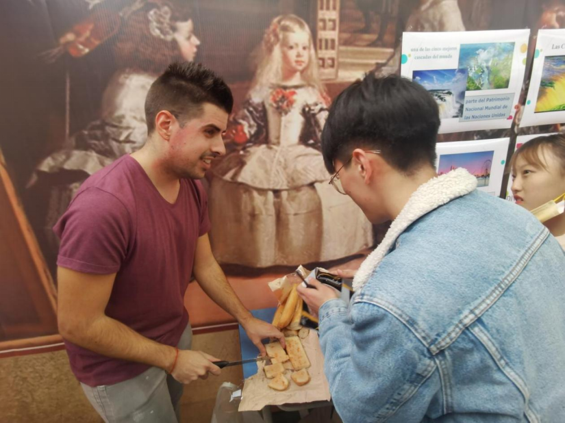 在西班牙语展区,摆放着西语书籍和介绍西班牙风情的手抄报,展区内还有咖啡文化的展示与趣学西语活动。西班牙外教Alberto亲手制作的tapas吸引了众多师生,大家在美食的陪伴下 畅谈丰富多彩的西班牙文化,趣味无穷。