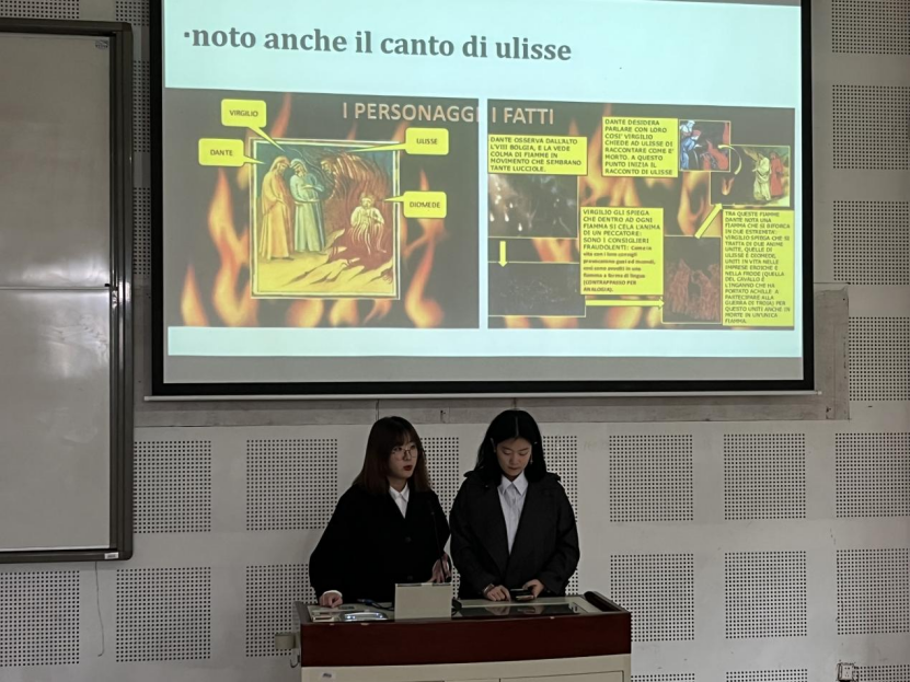 首先,评委老师展出了一段由同学们参演的意大利语戏剧表演视频。随后,但丁诗句朗诵比赛正式开始。2020级章玙瑞、王诗怡组,尹鹏谨、杨柳清组,车馨雨、崔玮婕组;2019级赵若伶、赵宇浩组,吕佳翼、汤子瑶组,李蕊、丁雨馨组,陈语、于冰清组分别选取了部分但丁诗句,用精彩的PPT展示和激情澎湃的朗诵向我们展现了意大利语的神秘魅力,更令我们深刻地感受到处于黑暗时代的但丁蕴于诗句中奋起反抗、反对压迫、崇尚自由的强大精神力量,使同学们感受到深深的震撼之情。