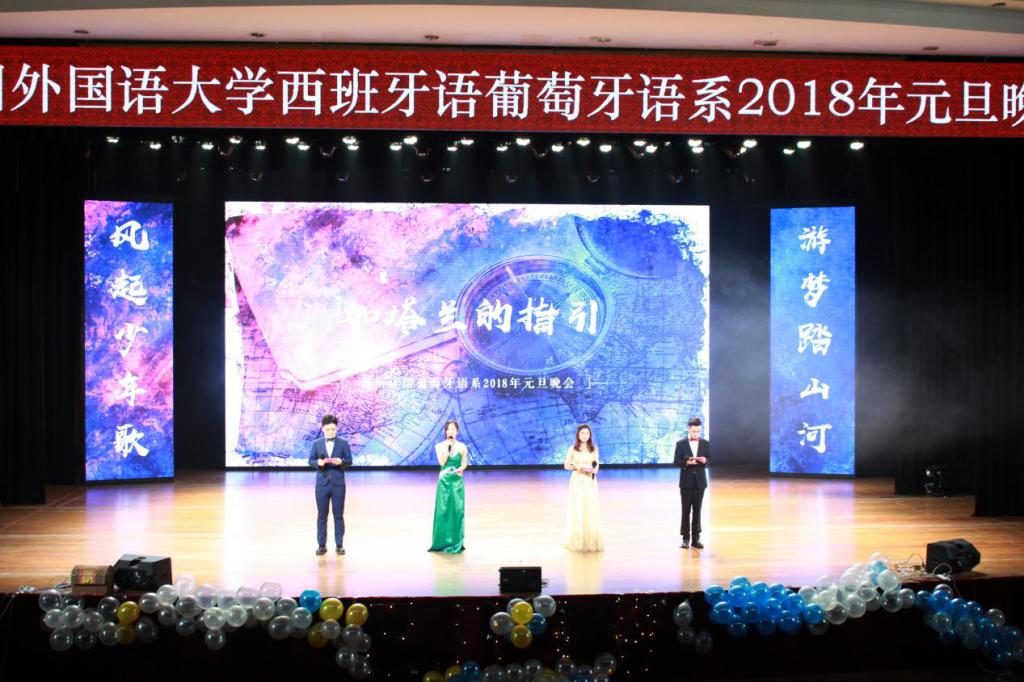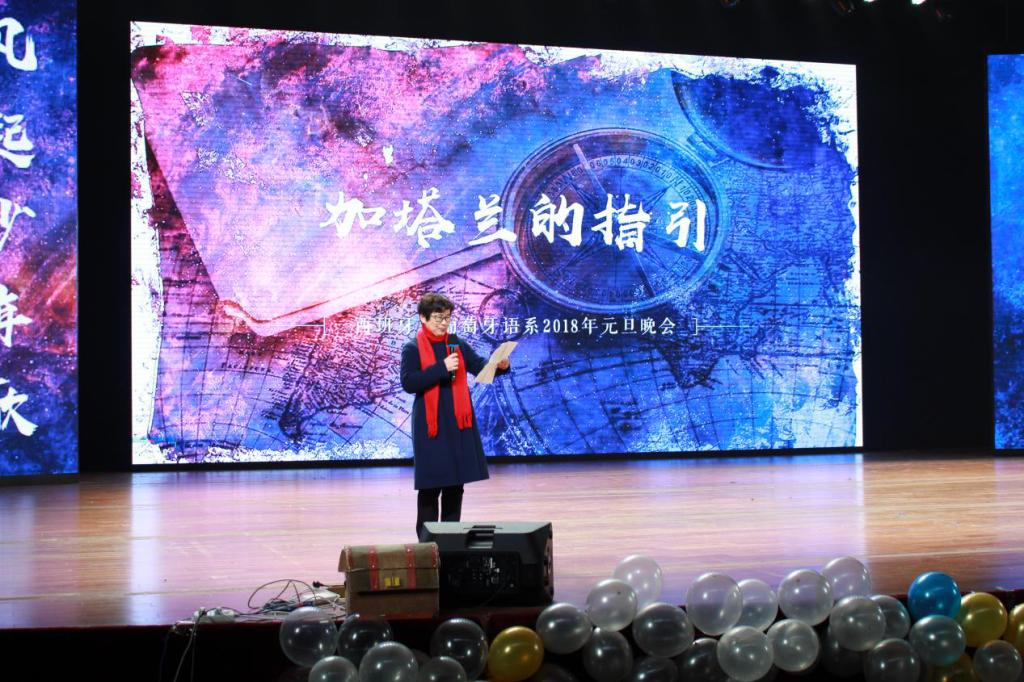 2017年12月4日晚7:30,西葡语系2018年度元旦晚会“加塔兰的指引”在东区大礼堂顺利举行。出席晚会的嘉宾老师有党总支书记孙蔓书记、罗应珍教授、副系主任许令仪老师、系主任助理童亚星老师和唐思娟老师、辅导员杜琨老师和辅导员段文佳老师及西葡语系各年级任课教师们。
