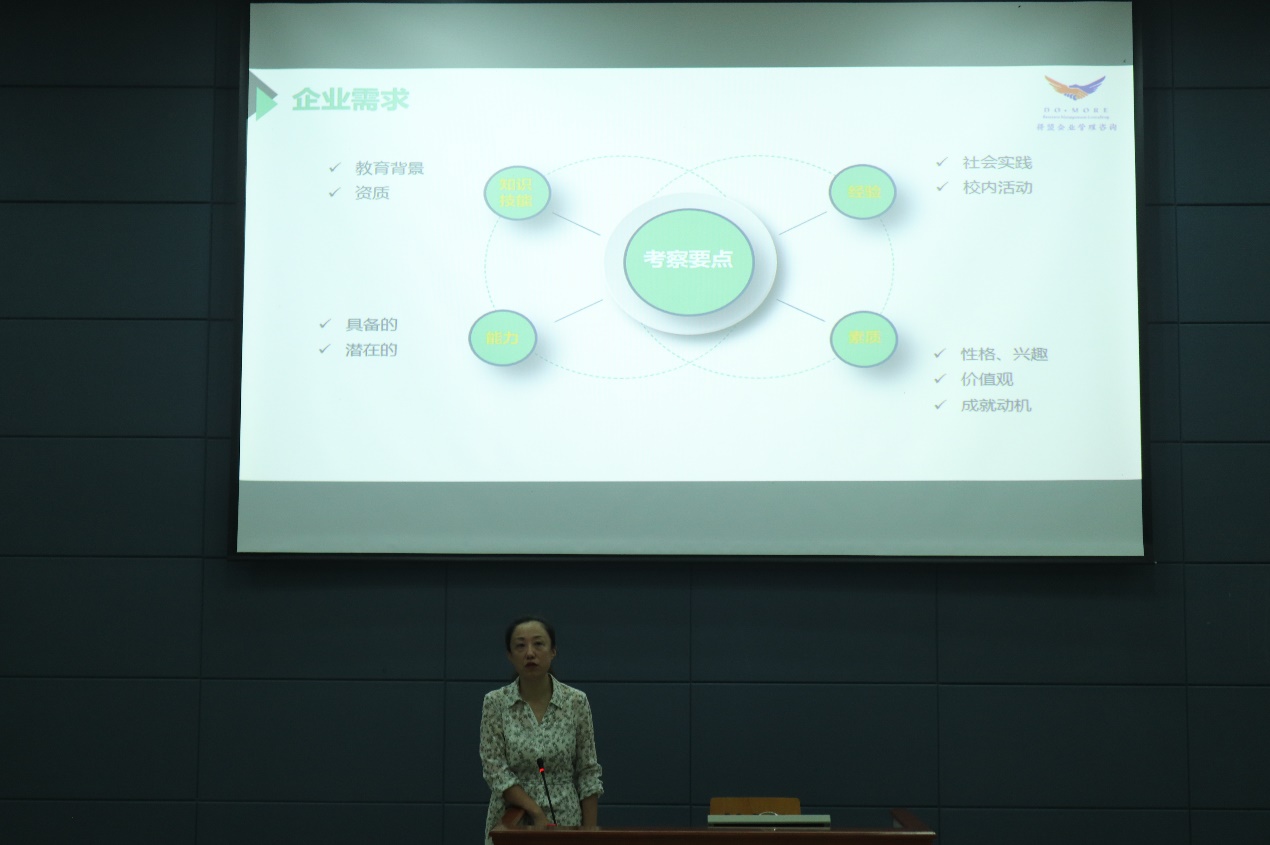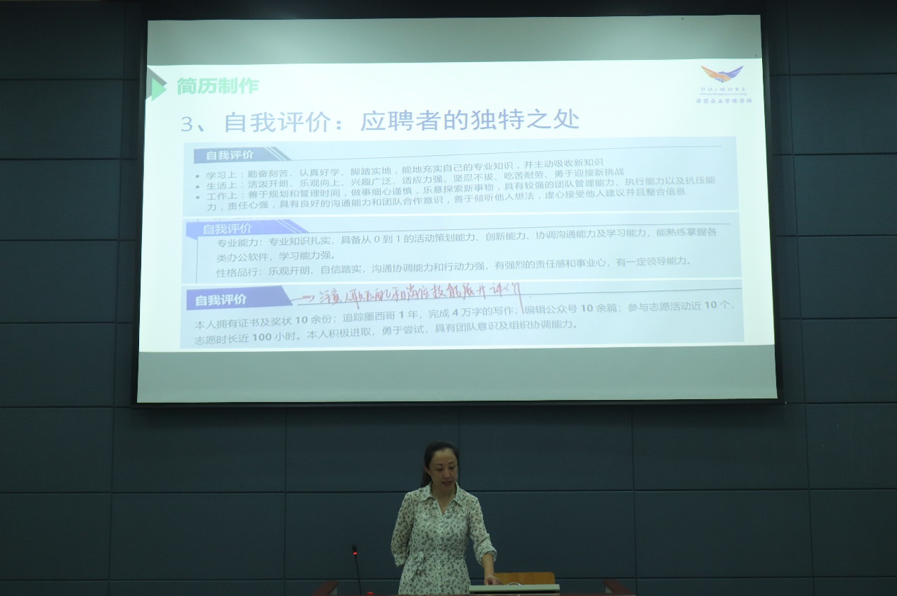 在简历指导环节,齐老师介绍了就业发展的具体考虑因素,并指出在编写简历前,同学们需要思考自己希望从事的职业以及自身的特点,从而找到最适合自己的职业方向。紧接着,她从职业基础、企业需求等方面进行了详细的介绍,让同学们对求职过程有了更清晰的了解。