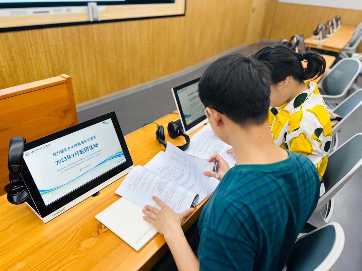 西方语言文化学院乌克兰语系于2023年9月13日在培英楼822智慧教室开展教研活动,乌克兰语教研室全体中教陈旭、高京和汪晓宇出席本次活动。