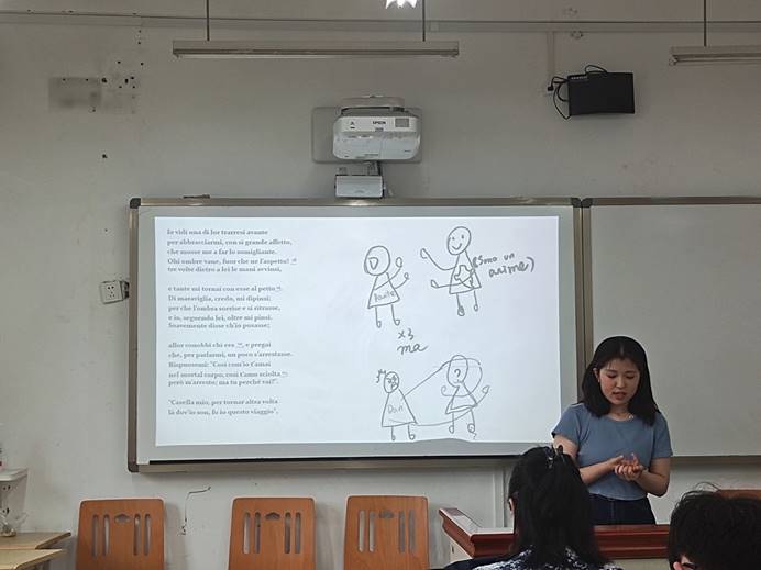 下午四时,迎着盛夏的骄阳,由Vincenza Armiento老师发起的意大利语“《神曲》故事会”活动在C503正式召开,2018级全体学生积极参与了本次活动。
