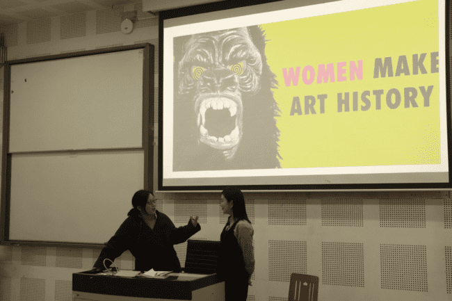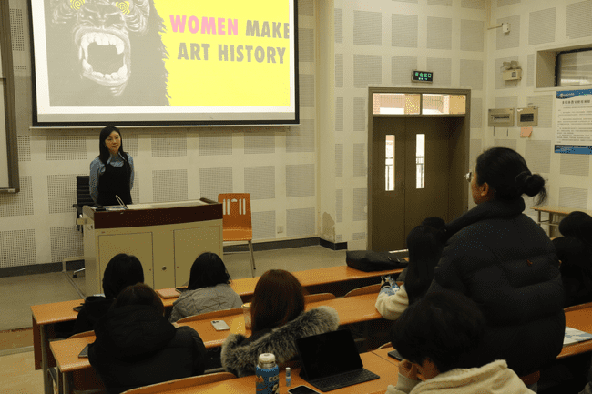 作为策展人,祝老师分享了策划女性艺术展览的心路历程以及女性艺术家所面临的困境,并强调女性艺术注重感知。同时,祝老师向同学们展示了部分著名女性艺术家作品,这些作品不仅反映女性共同所处困境以及她们个体的学术研究及艺术创作,还探讨人类自然共生与AI对现代社会影响。