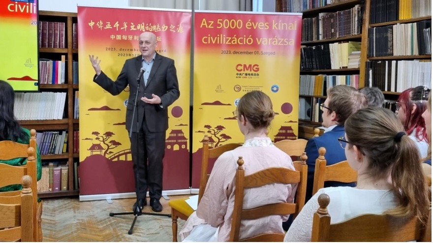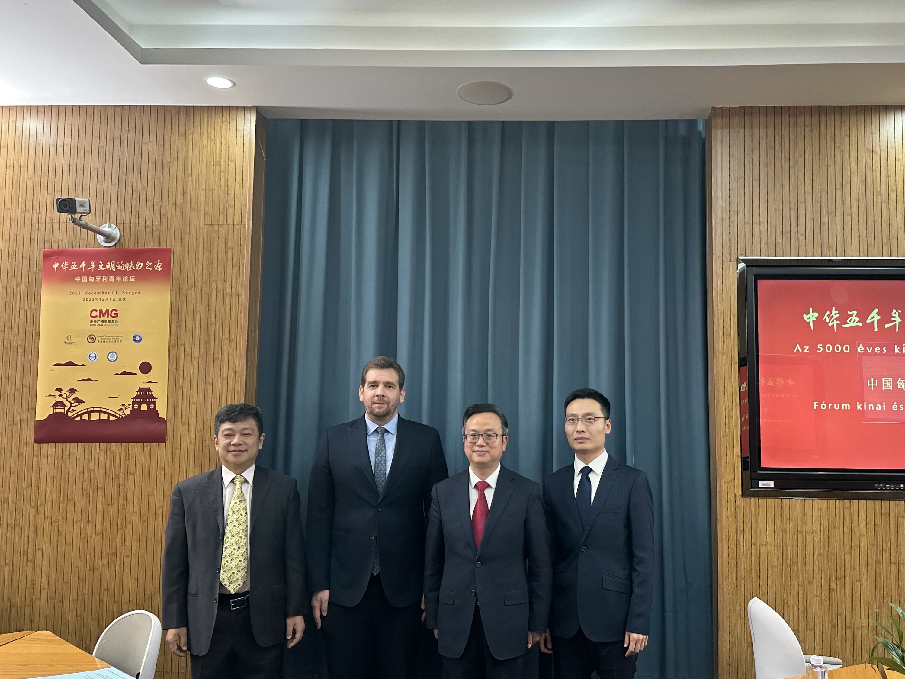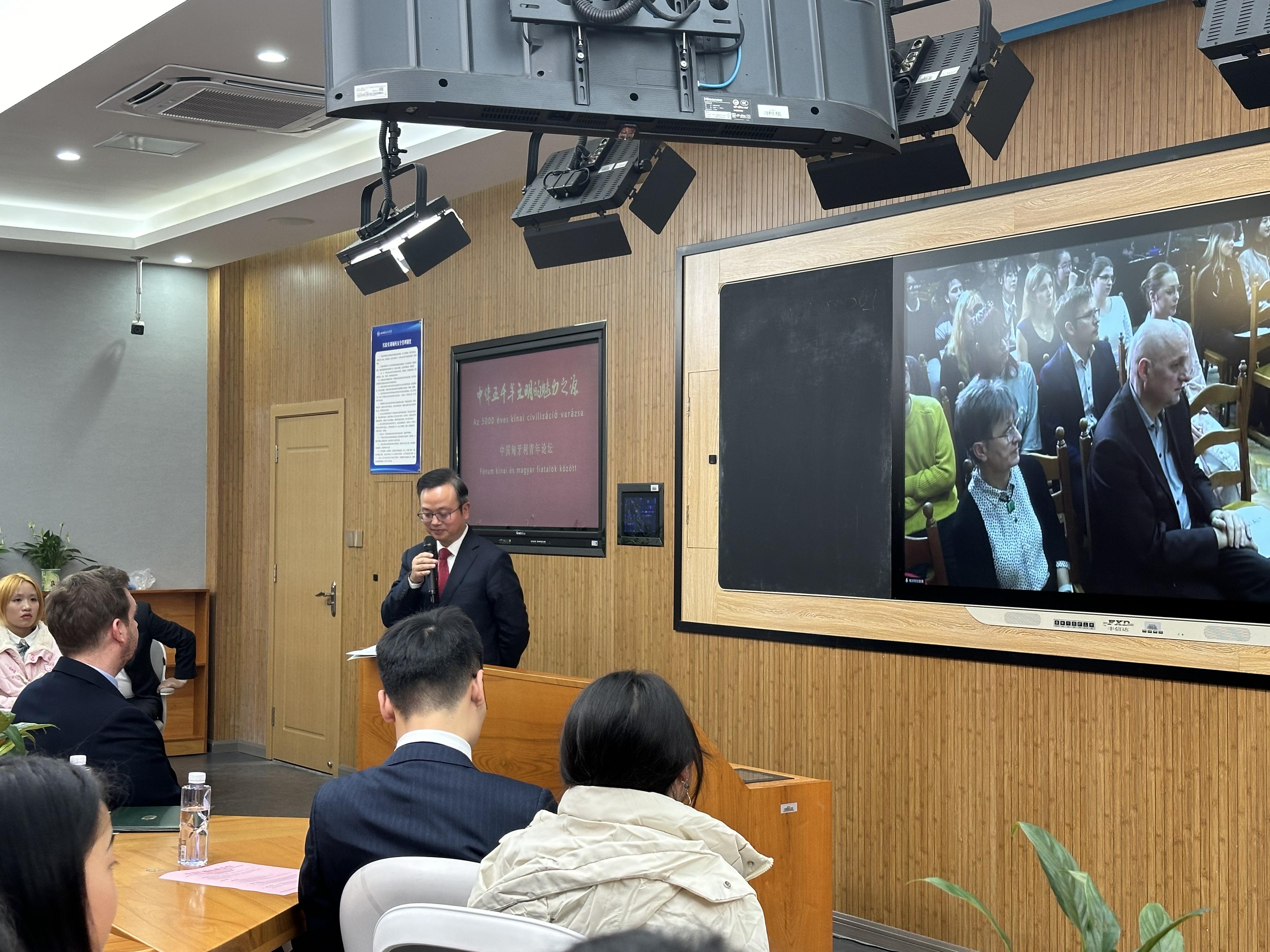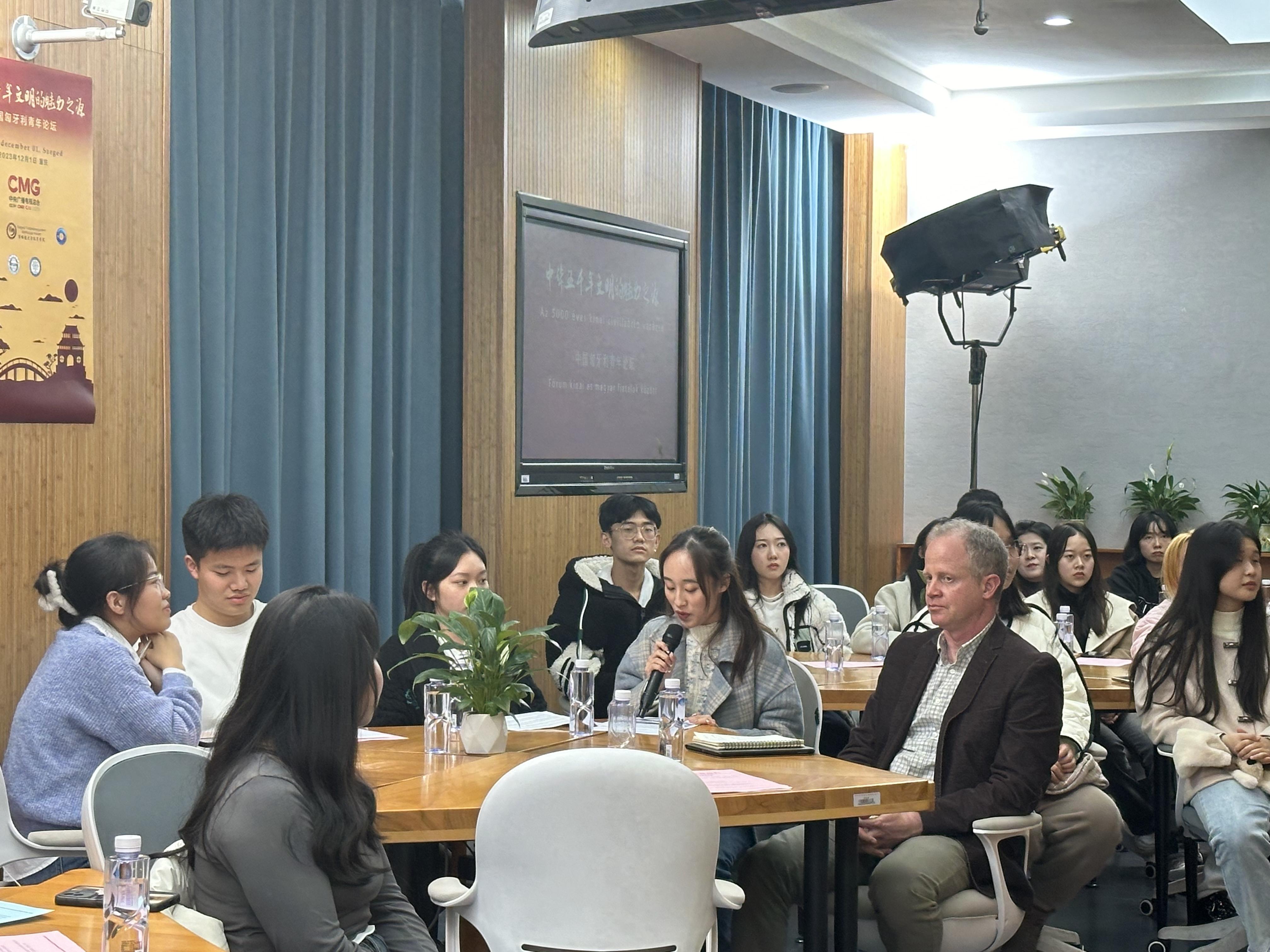 2023年12月1日,由中央广播电视总台和匈牙利布达佩斯中心电视台共同主办的“中华五千年文明的魅力之源——中匈青年对话”在中匈两地通过连线的方式成功举行。对话会上,塞格德市副市长纳吉·山多尔、匈牙利驻重庆总领事奇格尔·巴林特、太阳集团tyc122cc副校长祝朝伟教授、塞格德莫拉·弗朗茨博物馆副馆长巴恪尼·伊迪珂、匈牙利赛格德大学孔子学院匈方院长佐丹·亚历山大、北京外国语大学欧洲语言文化学院匈牙利语教研室主任许衍艺,中国社会科学院欧洲研究所助理研究员马骏驰先后做主题发言,中匈两国青年学生就中国文化进行了交流对话。本次论坛通过直播连线的方式进行,中国的主场设立在太阳集团tyc122cc。